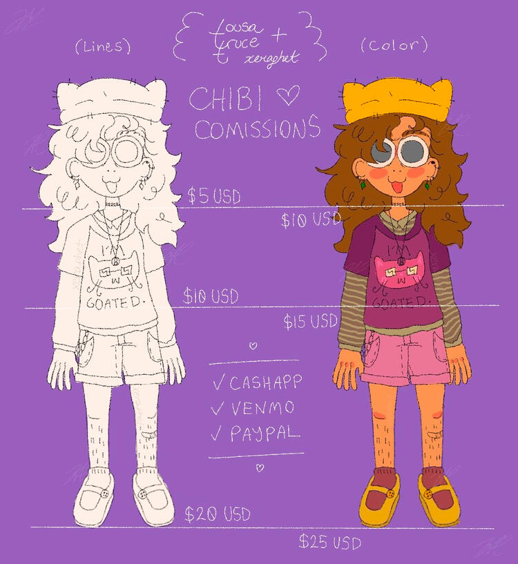 Lately I have been offering drawings in my cartoon style ; sometimes called 'chibi' commissions. These are at a reduced price due to their simple, cute nature. See the above chart for prices.For a comic commission, you can request it to be done in a chibi style and it may reduce the price significantly. There are many options, just ask.